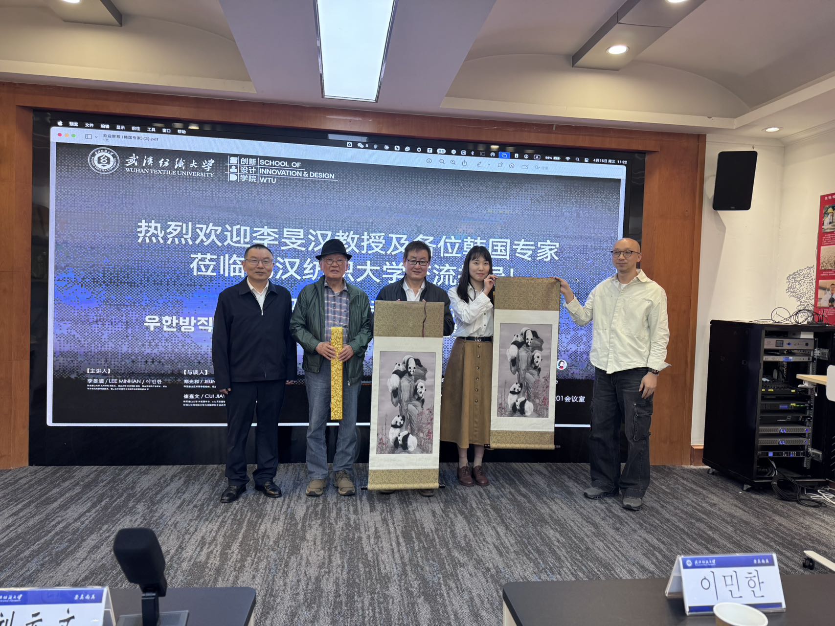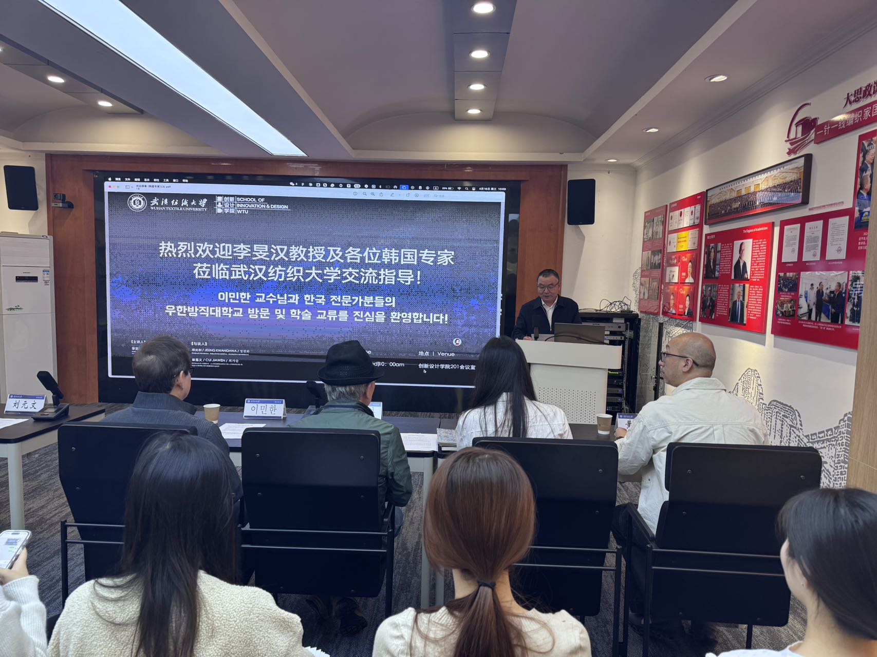 活动伊始,刘元文代表学院对三位专家远道而来表示热烈欢迎并简要介绍学院办学定位、学科特色与国际交流成果。他指出,中韩文化底蕴深厚、艺术审美相通,开展跨国学术交流,对推动设计艺术学科建设、提升人才培养质量具有重要意义。他希望以本次活动为契机,搭建长期稳定的交流平台,促进艺术理念互鉴、教学经验共享、科研项目共建,助力学院设计艺术教育高质量发展。