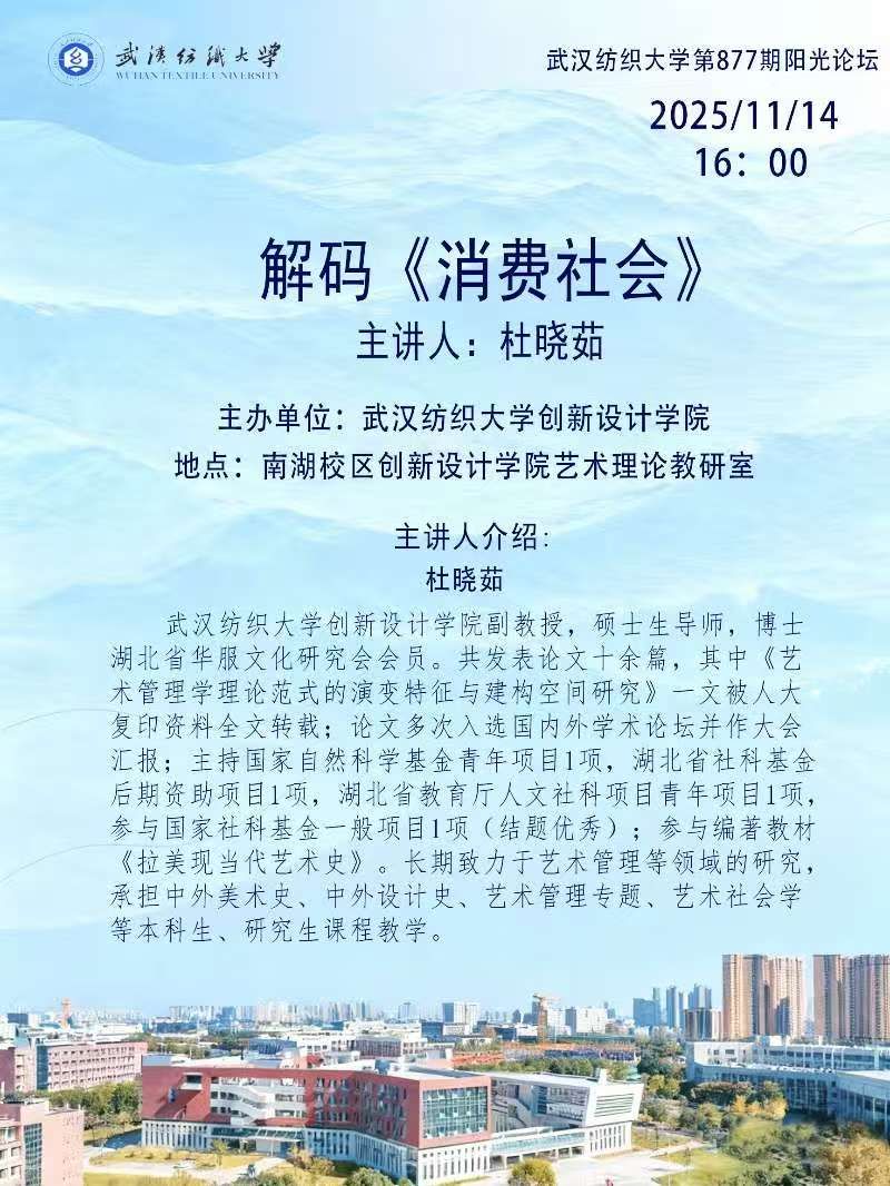 2025年11月14日下午,武汉纺织大学第877期阳光论坛在南湖校区创新设计学院艺术理论教研室举行。本次论坛主题为“解码《消费社会》”,由创新设计学院主办,学院副教授、硕士生导师杜晓茹担任主讲人。