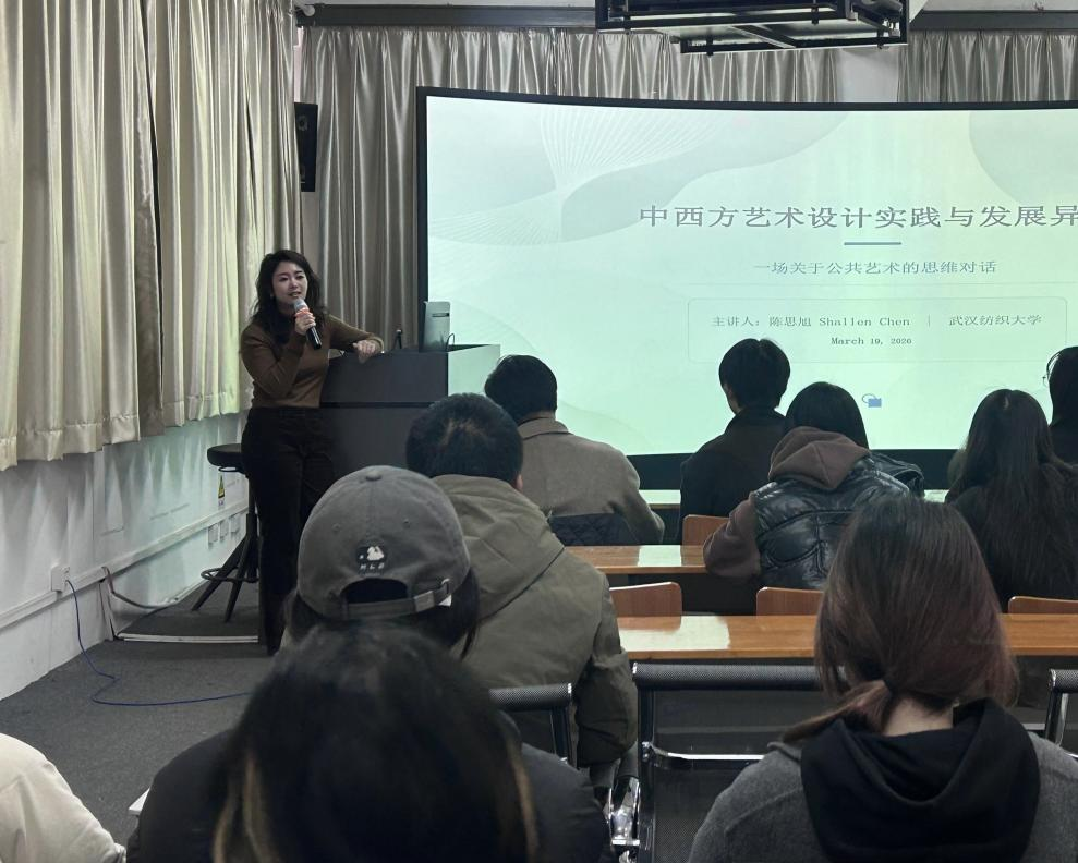 讲座中,陈思旭博士以中西方公共艺术设计的文化根基为切入点,系统梳理了国内外公共艺术在叙事方式、材料应用、结构逻辑、审美倾向的核心差异。她指出,中国公共艺术更强调意境营造、天人合一、文脉传承,在视觉表达上注重写意、留白;西方公共艺术则受科学理性与人文精神影响,突出形式创新、功能优先,二者形成鲜明不同;探究深层根源,陈思旭博士认为,中国设计源于“天人合一”的哲学思想与集体主义价值观,注重整体效能,项目实施多呈现自上而下的高效推进模式;西方设计则基于个人主义导向,强调逻辑思维与个体表达,作品创作更贴近公众生活,流程上多为自下而上的参与式模式。