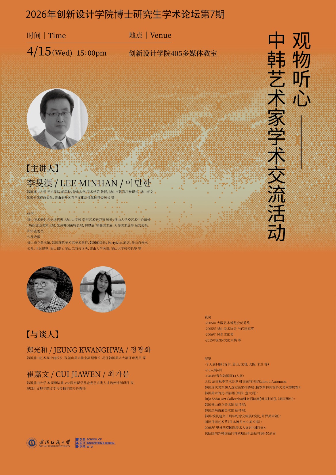此次中韩学术交流专项活动,紧扣博士研究生培养核心需求,不仅拓宽了博士研究生的国际学术视野,丰富了其科研创作与学术研究思路,更为学院优化博士培养模式、深化国际合作、推进学科博士点建设奠定了坚实基础。未来,创新设计学院将持续推进开放办学,搭建更多面向博士研究生的国际学术交流平台,推动中韩博士联合培养、科研项目共建,不断提升博士培养质量与学科国际影响力,助力培养更多具有国际视野、创新能力和深厚学术素养的高素质设计艺术博士人才。