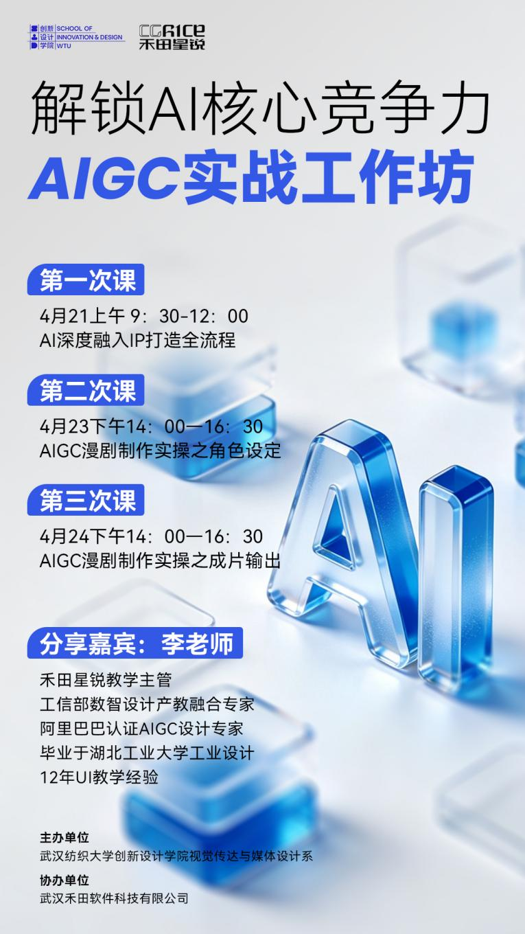 为推动设计专业人才紧跟人工智能发展浪潮,提升学生在 AIGC(生成式人工智能)领域的实操能力与创新思维,武汉纺织大学创新设计学院视觉传达设计系联合武汉禾田科技有限公司,成功举办了“解锁 AI 核心竞争力——AIGC 实战工作坊”系列活动。本次工作坊由视觉传达12401、12402班全体学生参与,邀请到禾田星锐教学主管、工信部数智设计产教融合专家、阿里巴巴认证AIGC设计专家李廉柱担任主讲嘉宾,为同学们带来了一场干货满满的AI设计技能提升课程。