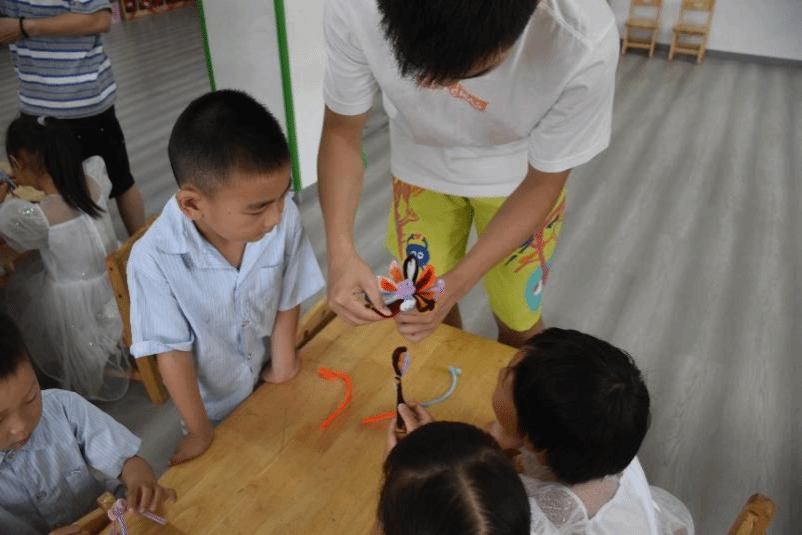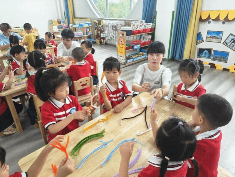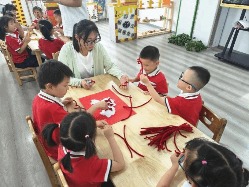 下午红色文化探索课程,小朋友们以小组为单位,用扭扭棒组合成了一副副被鲜花环绕的中国地图。本次课程借助扭扭棒作为探索的媒介,让孩子去动一动、玩一玩,让他们在扭一扭的过程中充分想象创造。该课程将美育融入教育教学,能增强孩子们的爱国意识。
