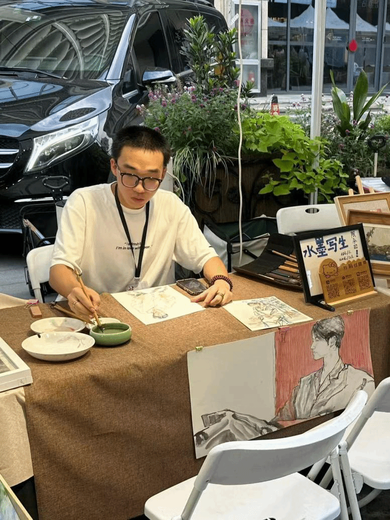 在本次活动中,观意艺术工作室准备的现场写生活动受到了许多关注与赞赏,史承鑫同学坐在摊位中间,热情的迎接每一位前来观摩的顾客,并为其中一些想在武汉留下别样记忆的顾客专门定制了一幅幅肖像写生作品。